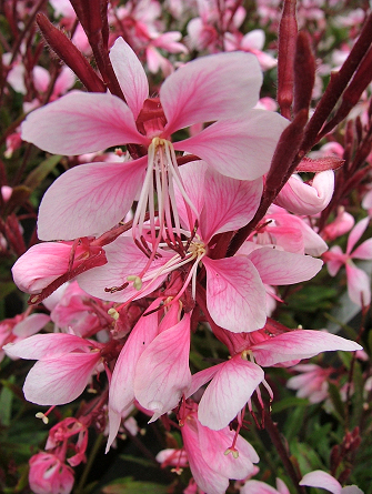 Gaura lindheimeri pink е компактен храст с височина до 60-70 см, с нежни розово-цикламени цветчета.