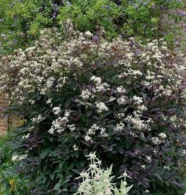 Прекрасни лилаво-бронзови листа с кичури от малки бели звездовидни цветчета с аромат, подобен на глог. Листата са най-цветни през пролетта и изискват известна опора, за да се поддържат изправени.